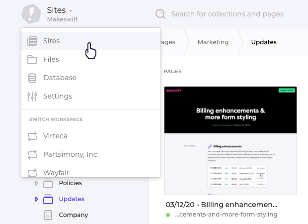 While using our product over the last many months, we've realized that it takes too many clicks to navigate around Makeswift. For example, it took 4 clicks to go from the page builder to your Files. You can now navigate to any area in the app much faster by clicking the Makeswift icon and using the new workspace dropdown.